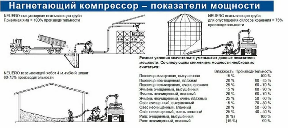 Пневмонавантажувачі зерна виробляються нашою компанією на заводі в Німеччині за принципом нагнітання з потужністю двигуна до 22 кВт, продуктивністю до 35 т/год.