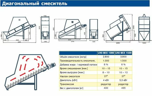 Диагональный смеситель NDM 1000 и NDM 1500 предназначены для высококачественного смешивания компонентов комбикорма в комбикормовых цехах, на животноводческих комплексах.Диагональный смеситель комбикорма хорошо подходит для смешивания большинства порошкообразных и гранулированных видов компонентов комбикорма с высокой точностью. Кроме того, в смеситель во время смешивания можно добавлять жидкие компоненты, такие какжир, кормовая патока и масло. Комбикорм смешивается благодаря медленному вращению большого донного шнека, это позволяет сохранить структуру сырья. Поэтому UNI-MIXтакже хорошо подходит для смешивания кормов для крупного рогатого скота и телят, с раздробленным материалом,который должен сохранить структуру.